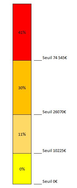 Cette jauge, est dotée de plusieurs seuils. A l'heure de l'écriture de l'article, en 2022, les seuils sont les suivants : 0€, 10225€, 26070€, 74545€, et 160336€ de revenus annuels.